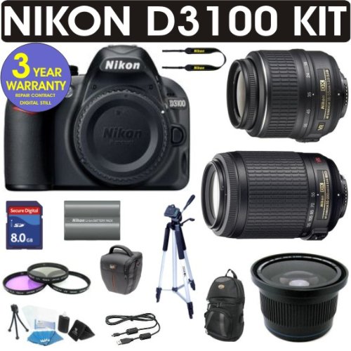 Nikon D3100 Digital Camera + Nikon 18-55mm VR Lens + Nikon 55-200mm VR Lens + .40x Wide Angle Fisheye Lens + Extra Battery + 3 Year Celltime Warranty